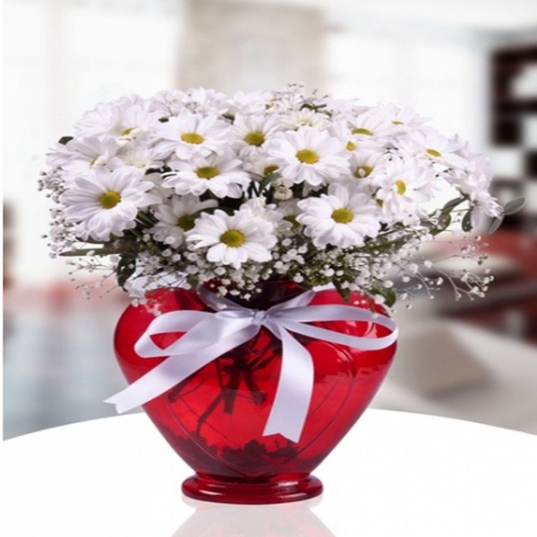 Kalp vazo içine hazırlanmış papatya çiçekleri! Papatya çiçekleri temiz bir kalbi simgeler bu çiçekler tam size göre! Çiçek hakkında bilgiler Papatya çiçeği sayısı: 23 adet Kullanılan diğer ürünler: Kalp cam vazo, yeşillikler, cipsolar Çiçeğin yaklaşık yüksekliği: 40 cm Renk: Beyaz