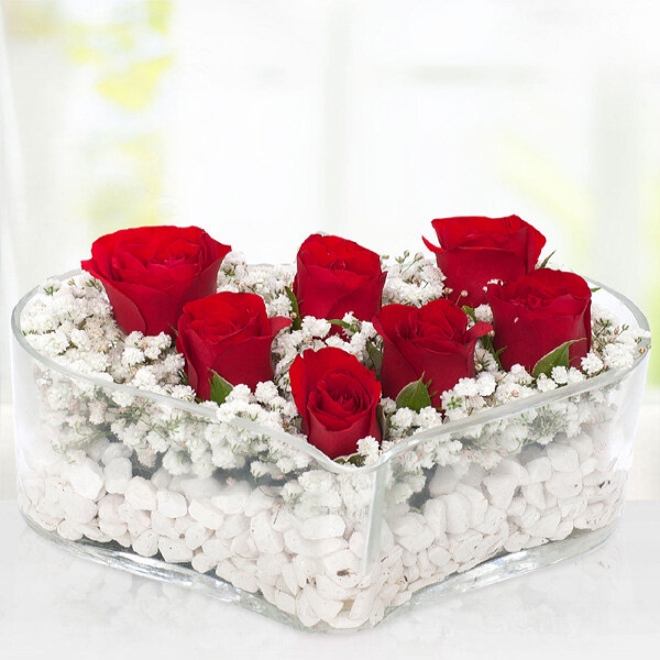 Kalp obje içerisinde 7 adet kırmızı gül ve cipsofilyalar ile hazırlanmıştır.